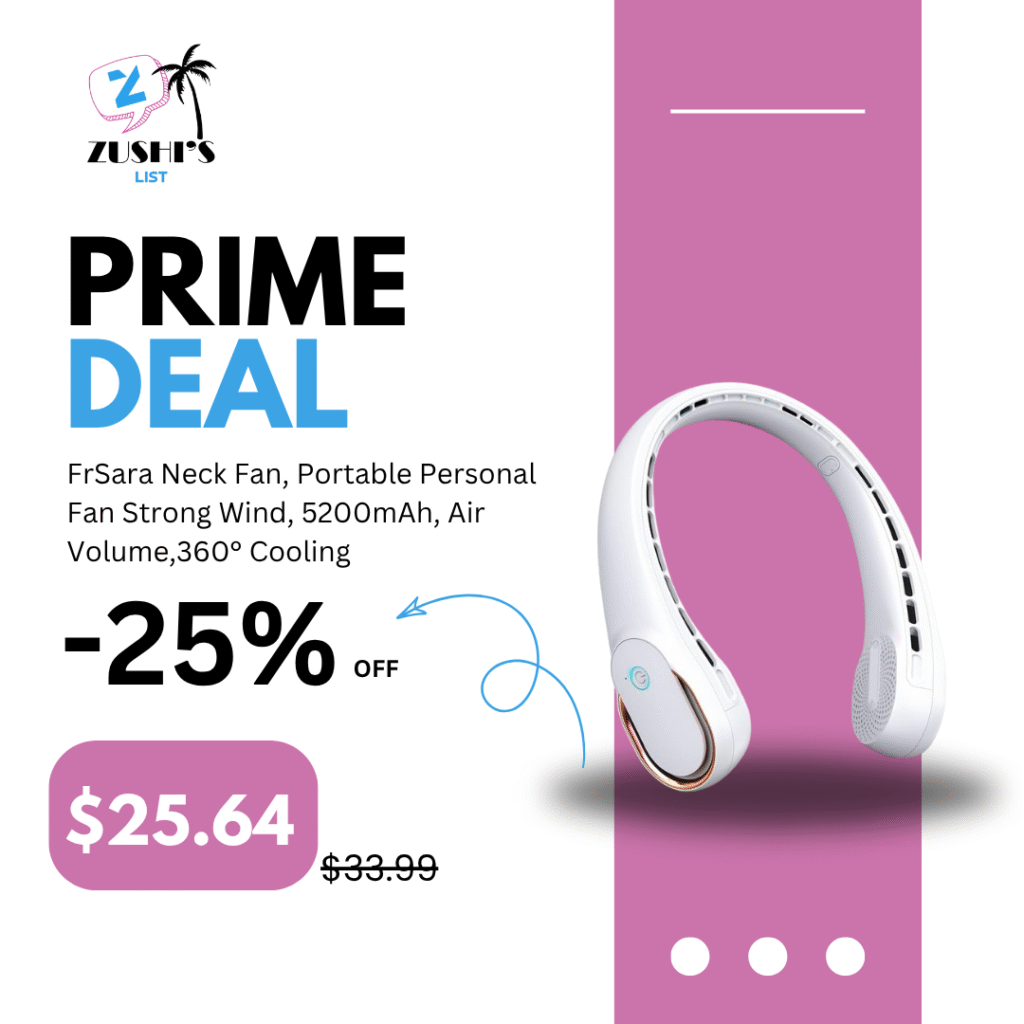 FrSara Neck Fan, Portable Personal Fan Strong Wind, 5200mAh, Air Volume,360° Cooling, No Hair Twisting, Air Volume On 2 Sides, Non-Slip, Quick Charge, Long Use Time, Gift for Father, Dad, Women