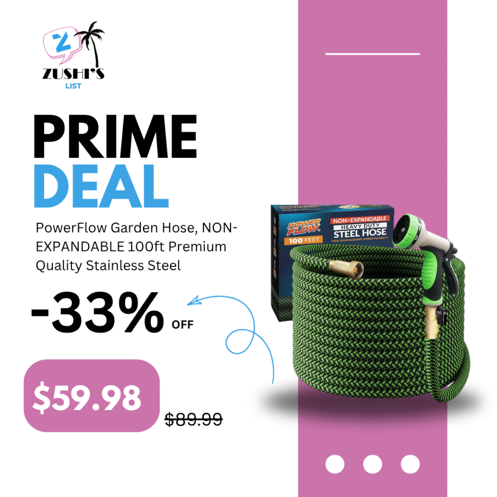 PowerFlow Garden Hose, NON-EXPANDABLE 100ft Premium Quality Stainless Steel Metal Water Hose with Durable Fabric Skin, Hose For Commercial, Residential Use, Bonus 10-way Spray Nozzle (100 Ft, Green)