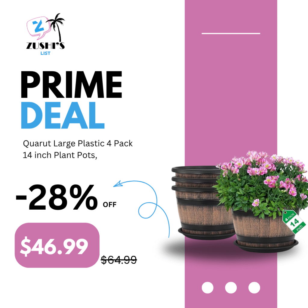 Quarut Large Plastic 4 Pack14 inch Plant Pots,Whiskey Barrel Planters with Drainage Holes & Saucer.Flower Pots Imitation Wine Barrel Design for Indoor & Outdoor Garden Balcony Plants.5 Gallons(Brown)