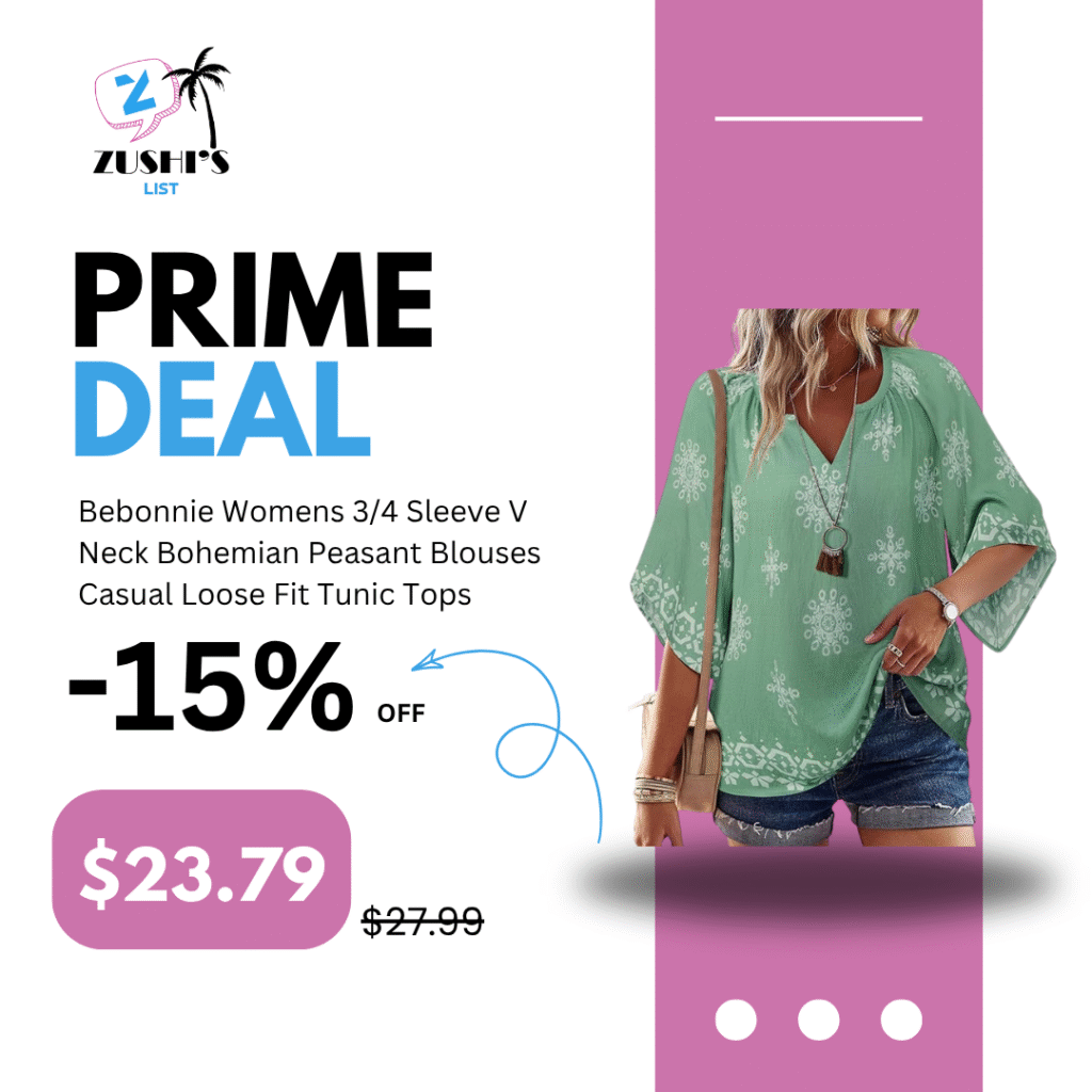 Bebonnie Womens 3/4 Sleeve V Neck Bohemian Peasant Blouses Casual Loose Fit Tunic Tops
