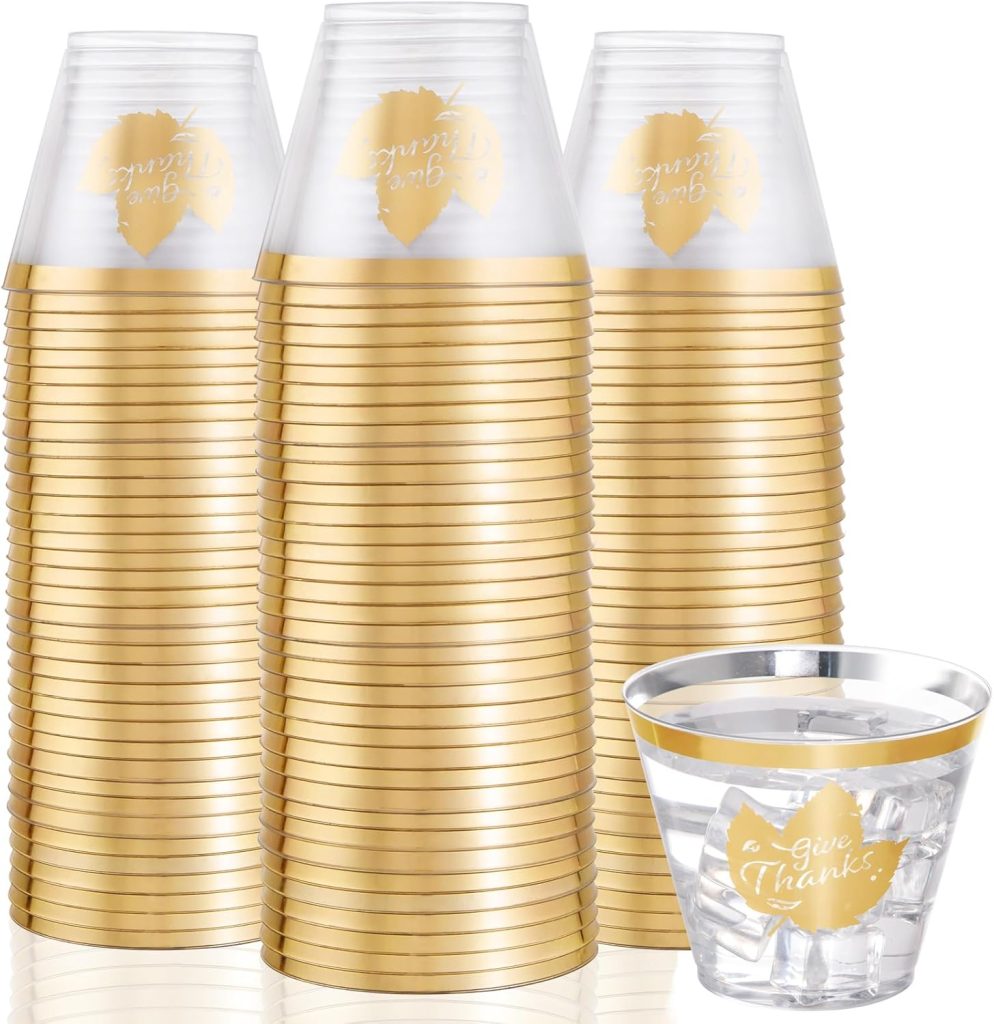 100 Pack Rose Gold Plastic Cups, 9 oz Clear Plastic Cups Tumblers, Elegant Rose Gold Rimmed Plastic Cups, Disposable Cups with Rose Gold Rim Perfect for Wedding, Thanksgiving Day, Christmas Party Cups