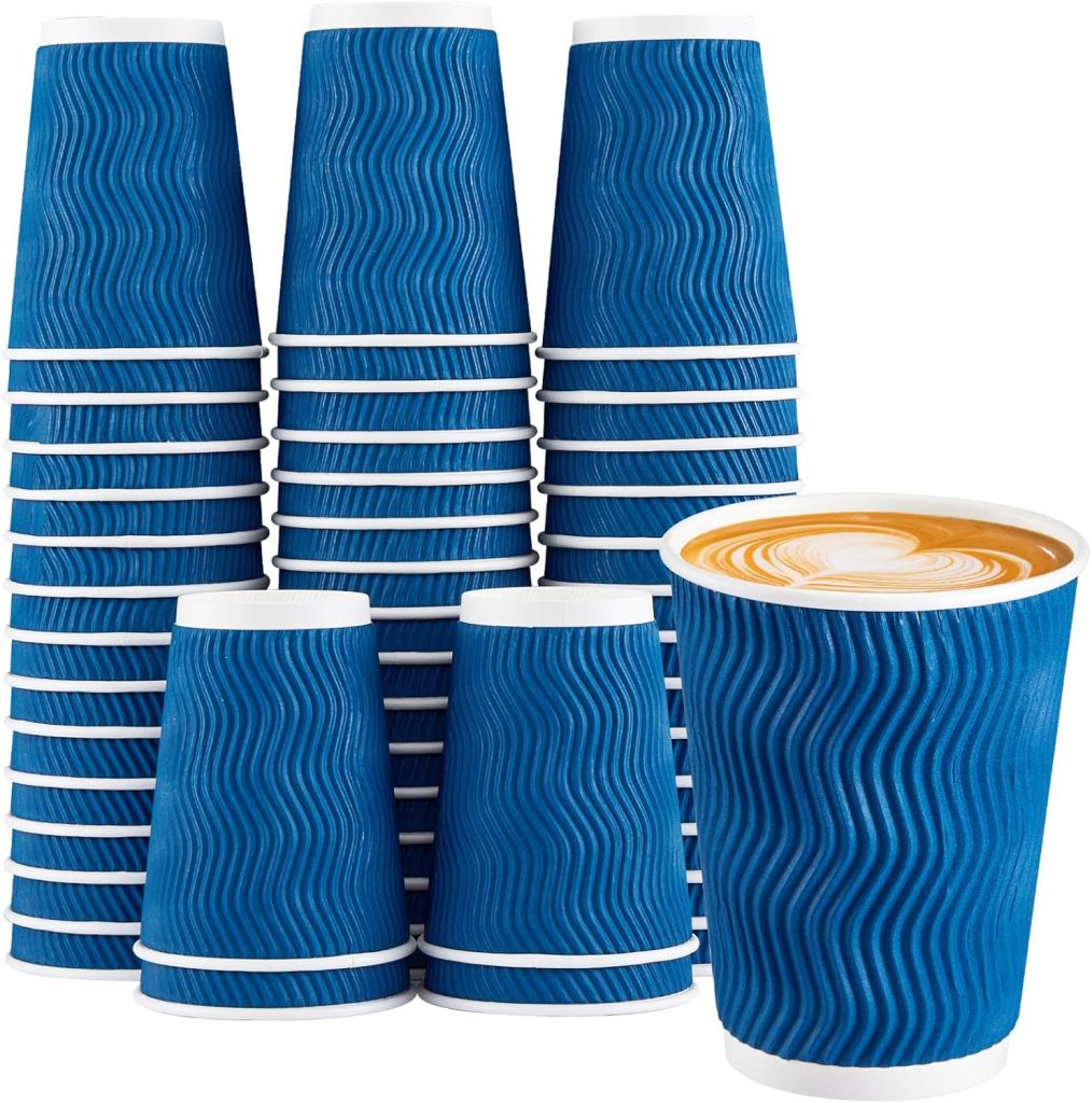Lamosi 12 oz Insulated Coffee Cups Disposable – 50 Count Blue Paper Coffee Cups No Lids 12oz, Corrugated Ripple Wall Design for Hot Cold Drinks