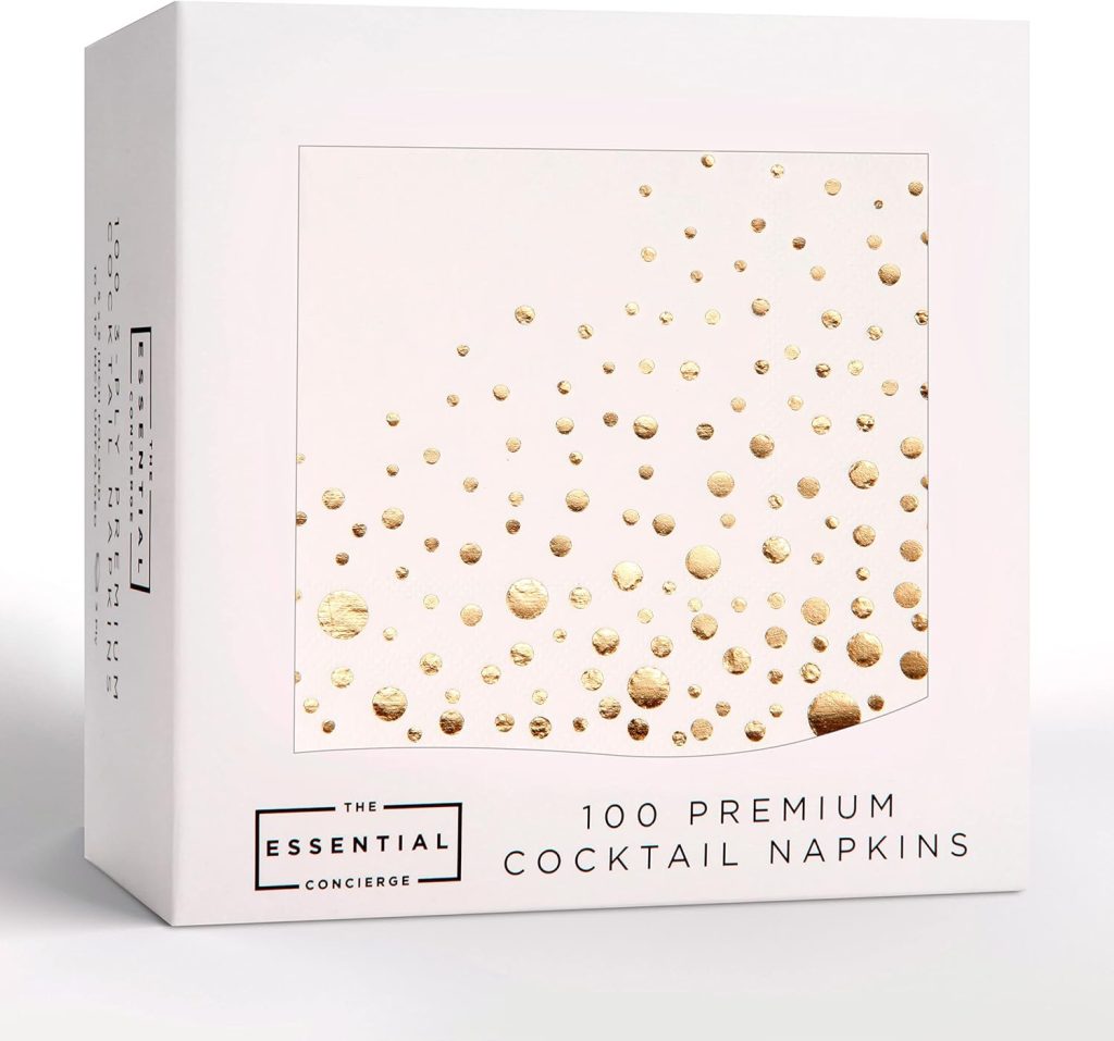 Stylish Gold Cocktail Napkins, 100 Holiday Cocktail Napkins, Paper Christmas Cocktail Napkins, 3-Ply White and Gold Napkins, 5 x 5 Inch Gold Party Napkins, Disposable Gold Napkins, Dessert Napkins