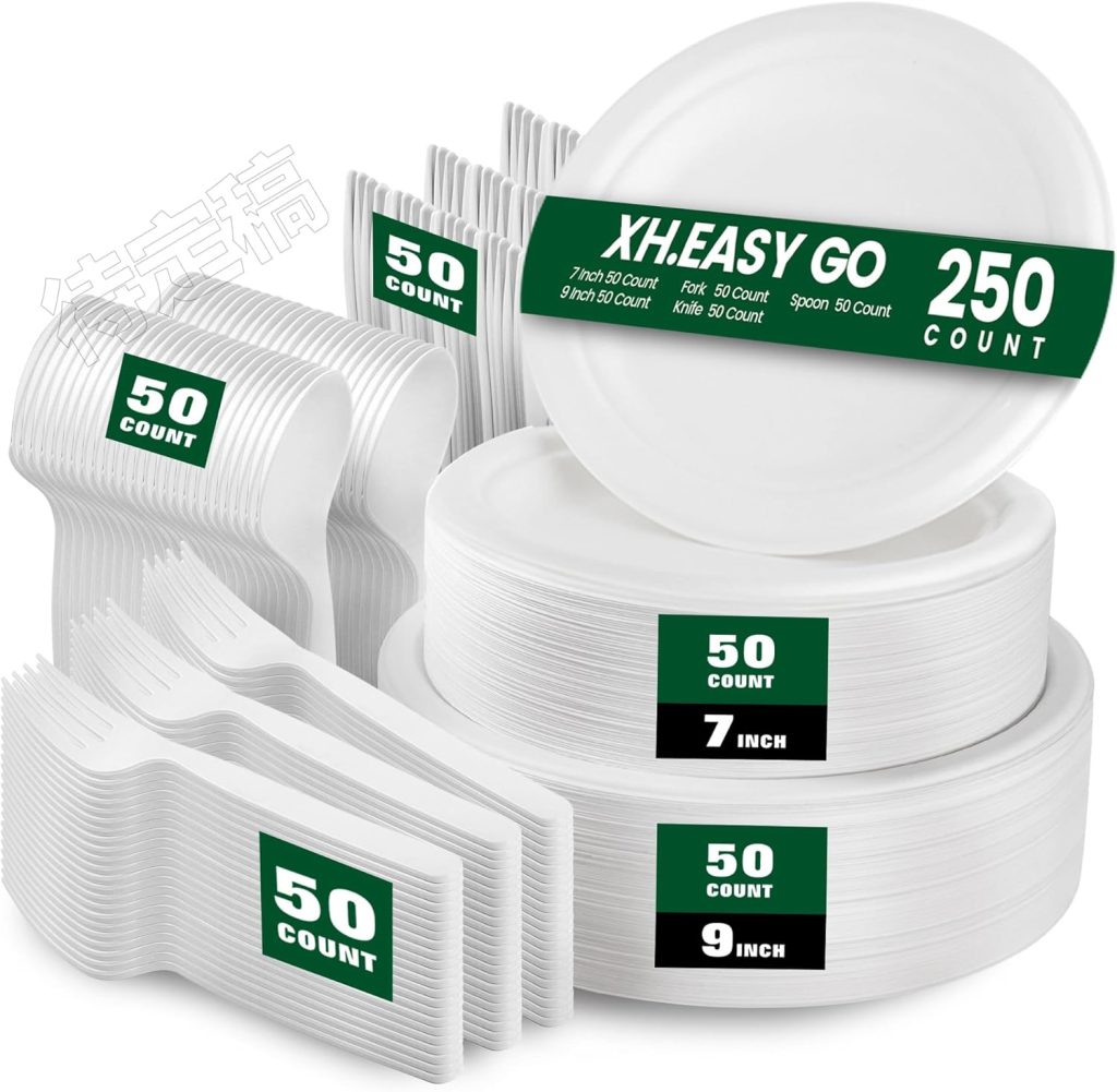 Disposable Paper Plates and Utensils Set [250 PCS] with 50 x 7 Inch Plates, 50 x 9 Inch Plates, 50 Knives, 50 Forks & 50 Spoons, Unbleached Eco-Friendly Paper Dinnerware Set for 50 Guests
