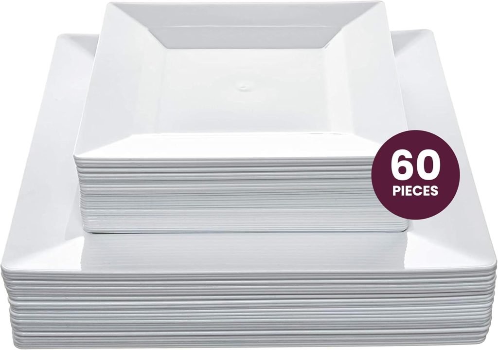 Aya’s 60ct White Square Disposable Plates – Heavy Duty Plastic Party Plates for Christmas, Thanksgiving (30 Dinner & 30 Salad)