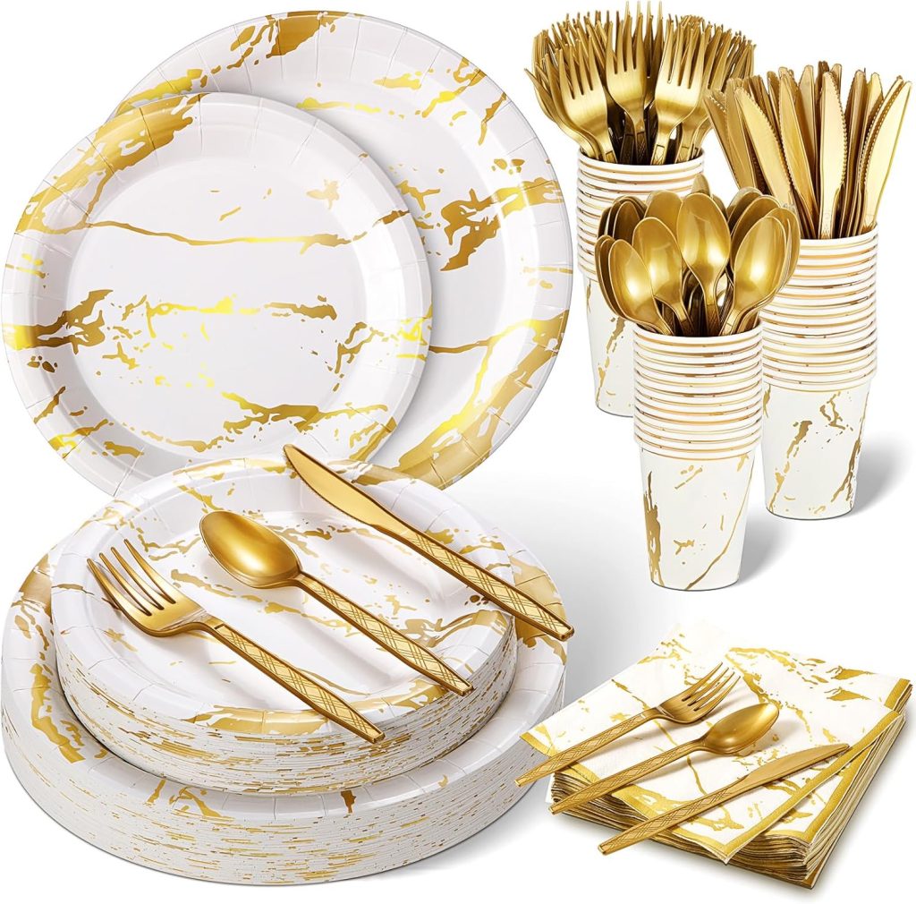 Bokon 350 Pcs Chinese New Year Disposable Dinnerware Set Include 100 Plates 50 Paper 9 oz Cups 50 Sets Spoons Forks Knives 50 Napkins for 50 Guests(White and Gold)