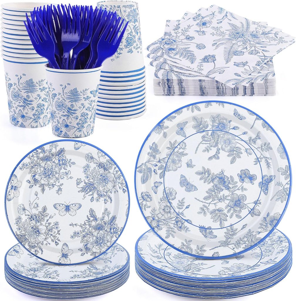 durony 144 Pieces Blue and White Flower Disposable Tableware Set 9 Inch 7 Inch Elegant Floral Paper Plates Blue Floral Cups Napkin and Forks Serve 24 for Birthday Baby Shower Party Supplies