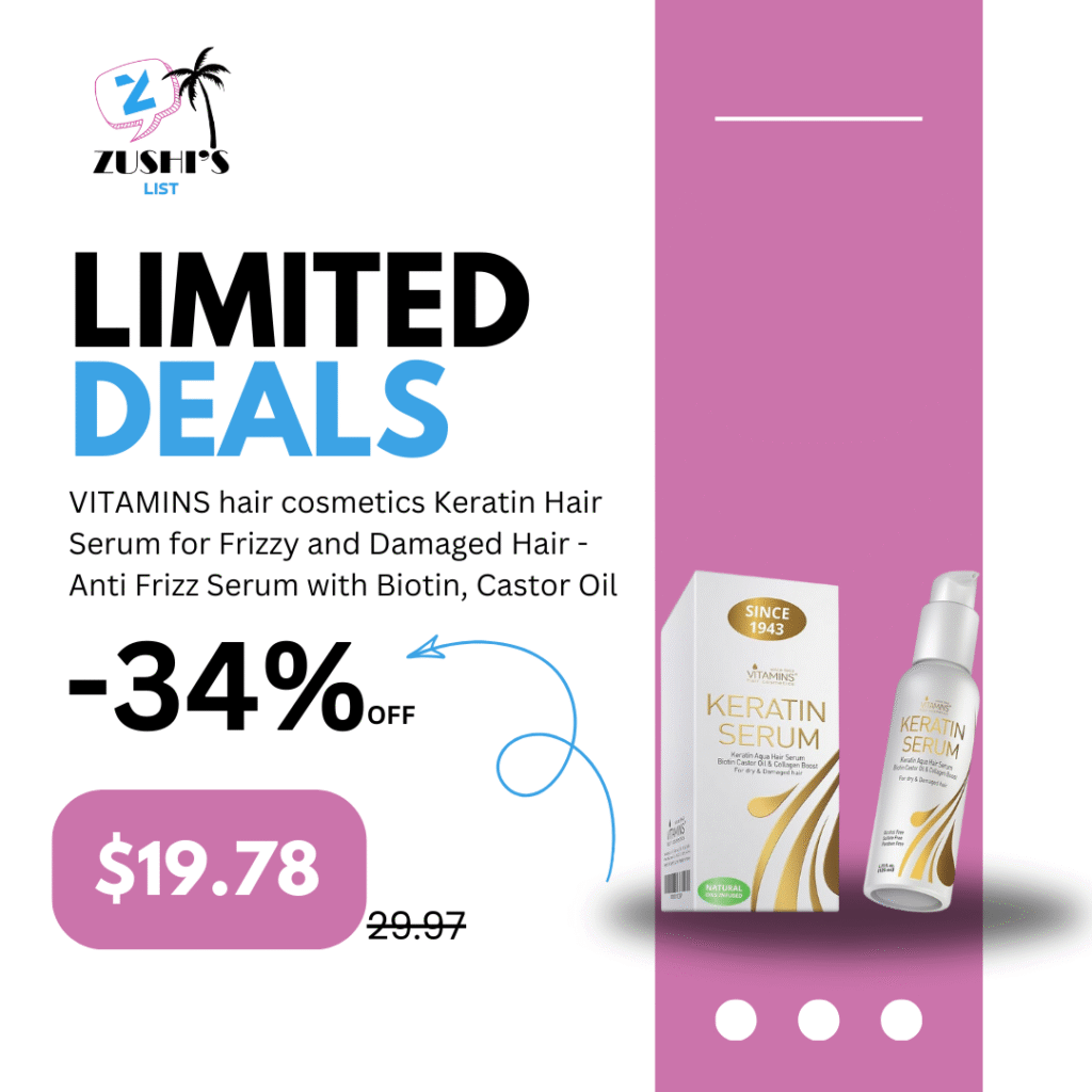 VITAMINS hair cosmetics Keratin Hair Serum for Frizzy and Damaged Hair – Anti Frizz Serum with Biotin, Castor Oil & Collagen for Heat Protection, Shine and Gloss Treatment – 4.25 Fl Oz
