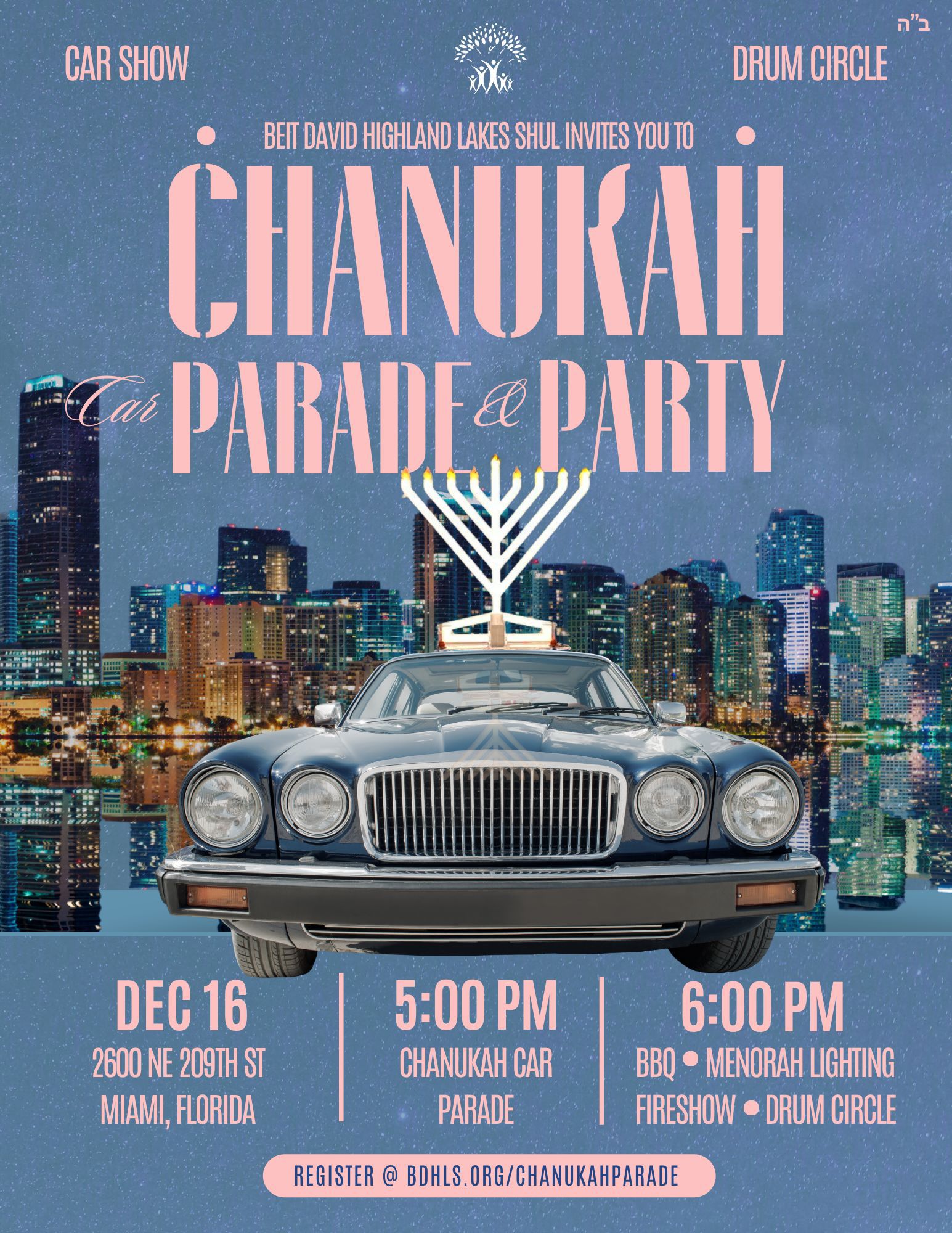 Enjoy a fire show, drum circle, bbq dinner, vintage cars, Sonny’s donuts, fire-truck gelt throw, menorah lighting, and activities for all ages.