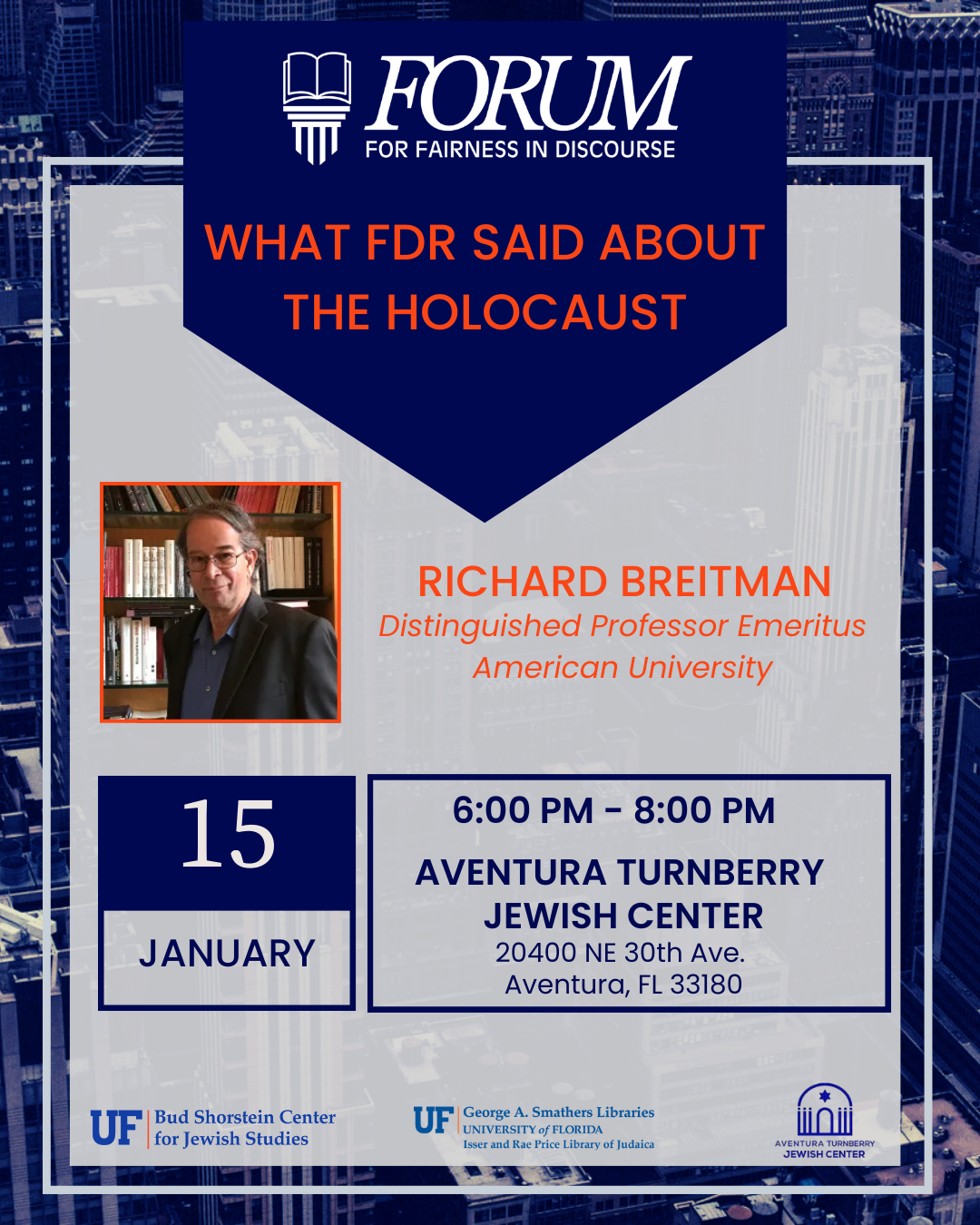 The Bud Shorstein Center for Jewish Studies at the University of Florida invites you to join us for an evening with renowned Holocaust scholar Dr. Richard Breitman, who will discuss President Franklin D. Roosevelt’s 1944 public statements on Nazi atrocities. What could Roosevelt say as more information became known? What could he not mention? What determined the president’s discourse concerning Nazi mass murder?