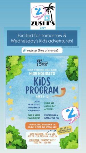 Give your child a special High Holidays experience! Chabad of Venetian & Sunset Islands is hosting a fun, safe, and interactive kids program for ages 1–12. Activities include edible art, educational games, and holiday celebrations led by experienced counselors. Register for free and let your children enjoy Rosh Hashana and Yom Kippur in a warm and engaging environment.