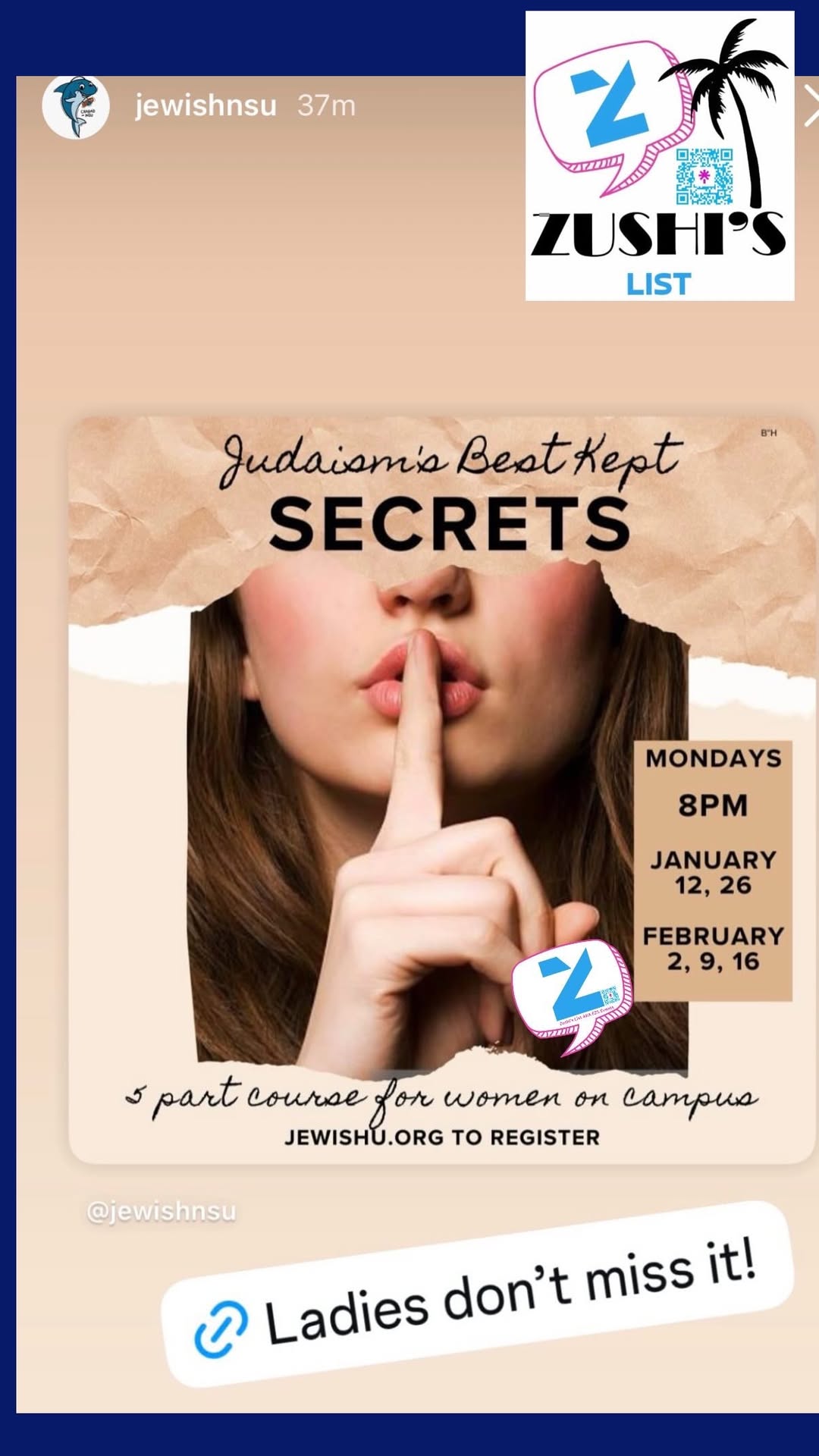 You’re invited to Judaism’s Best Kept Secrets, a 5-part course for women hosted by Jewish NSU. This engaging series explores meaningful ideas, depth, and inspiration within Judaism in a warm, welcoming campus setting designed for connection and growth.