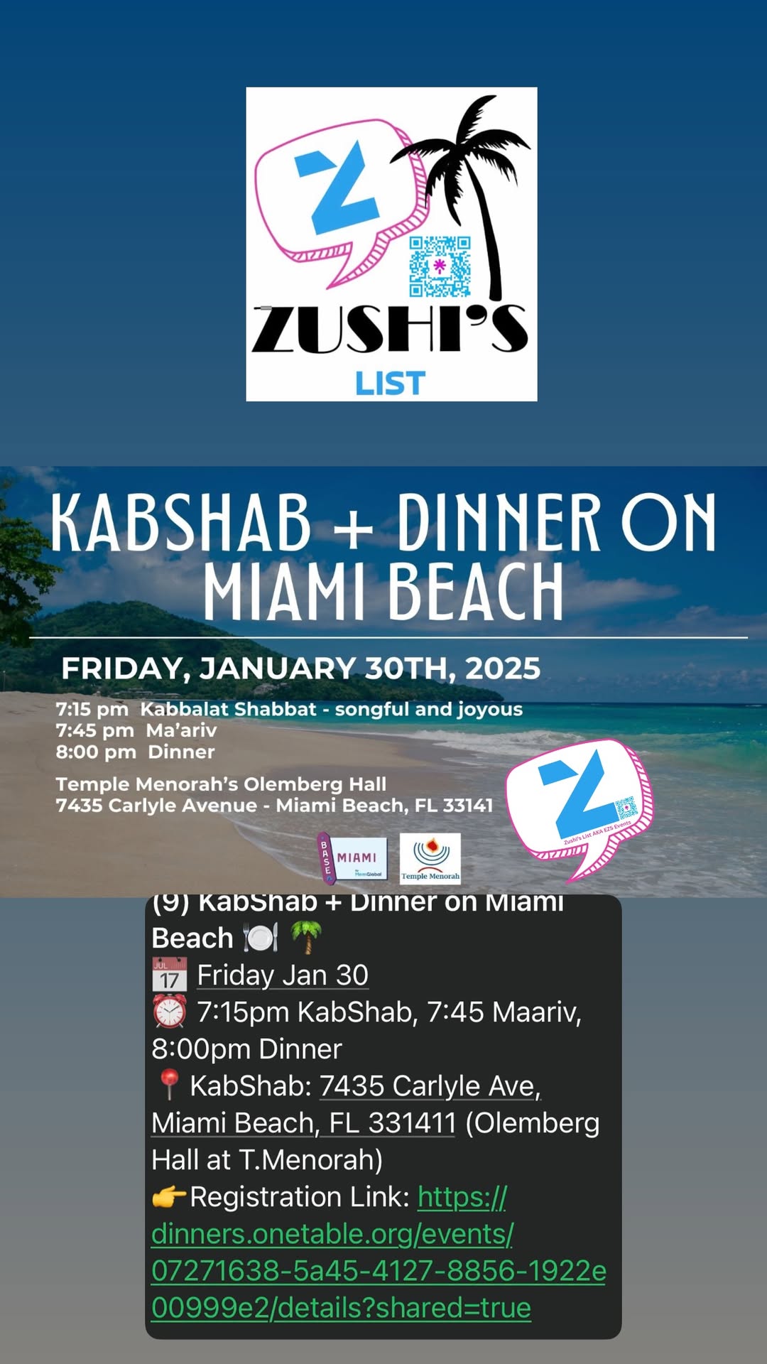 You’re invited to a beautiful KabShab + Dinner experience on Miami Beach, hosted at Temple Menorah. Begin the evening with a songful and joyous Kabbalat Shabbat, followed by Ma’ariv and a warm community dinner — the perfect way to welcome Shabbat together in a relaxed, uplifting atmosphere.