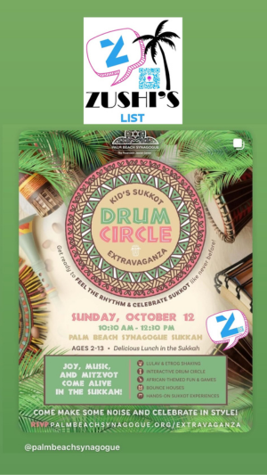 Get ready to feel the rhythm of Sukkot at Palm Beach Synagogue’s Kid’s Sukkot Drum Circle Extravaganza on Sunday, October 12, 2025, from 10:30 AM – 12:30 PM. Children ages 2–13 will enjoy an unforgettable celebration with interactive drumming, African-themed fun and games, bounce houses, lulav & etrog shaking, and hands-on Sukkot experiences. A delicious lunch in the sukkah will be served, making this a family-friendly event filled with joy, music, mitzvot, and community spirit. RSVP today and celebrate Sukkot in style!