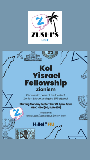 Join the Kol Yisrael Fellowship at Hillel FIU beginning Monday, September 29, from 4–5 PM. This fellowship offers students the chance to explore the many facets of Zionism and Israel through meaningful peer discussions. Participants will receive a $175 stipend while engaging in thought-provoking conversations that strengthen identity, community, and connection to Israel.