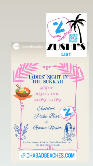 Celebrate Sukkot with a festive Ladies’ Night in the Sukkah hosted by Chabad of the Beaches. Enjoy a delicious poke bar, fun games, and a cozy evening connecting with friends in the spirit of the holiday. Perfect for community bonding and Sukkot celebration, this event is open to all women — RSVP to secure your spot.