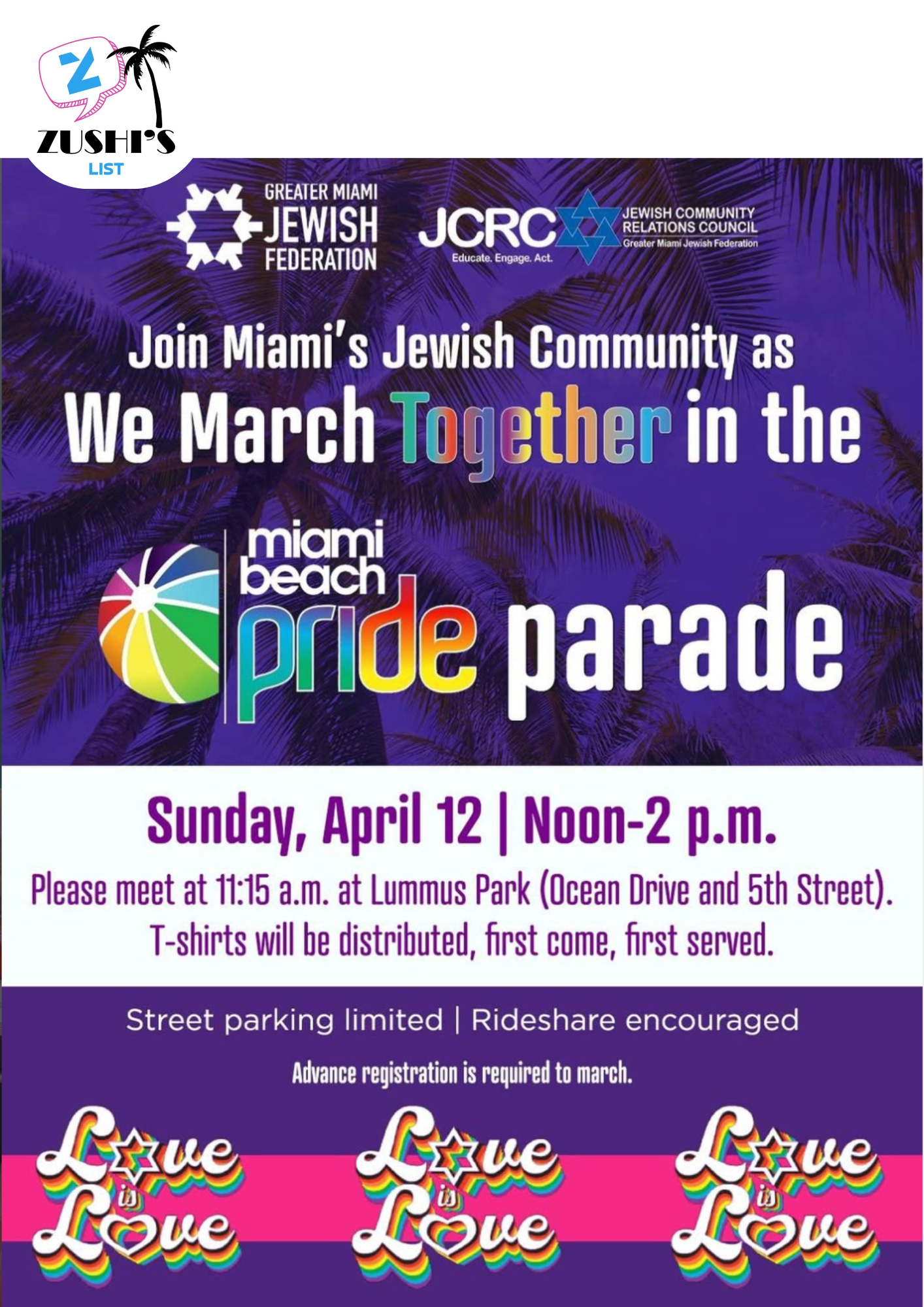 Join the Miami Jewish Community on April 12th at Lummus Park for a celebration of love and community as we march together for the Miami Beach Pride Parade! The parade begins at noon, but t-shirt distribution begins at 11:15 AM, so get there early for a free shirt…first come, first serve!