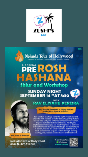 Join Nekuda Tova of Hollywood for a special Pre-Rosh Hashana Shiur and Workshop with Rav Eliyahu Pereira on Sunday, September 14 at 8:30 PM. Rav Eliyahu Pereira, a Torah teacher and spiritual guide from Tzfat, blends the depth of Kabbalah and Chassidut with practical tools for daily life. His teachings, inspired by Rebbe Nachman of Breslev, emphasize simplicity, joy, heartfelt prayer, and personal transformation. This unique evening will help prepare your heart and mind for the new year. Open to both men and women, the event will be held at Nekuda Tova of Hollywood, 3830 N. 40th Avenue.