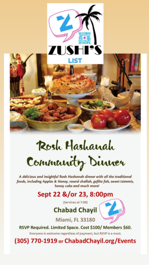 Celebrate the Jewish New Year with a warm and meaningful Rosh Hashanah Community Dinner at Chabad Chayil in Miami. Guests will enjoy traditional holiday foods such as apples and honey, round challah, gefilte fish, sweet tzimmes, honey cake, and more. The evening begins with services at 7:00 PM followed by dinner at 8:00 PM. With limited space available, advance RSVP is required. Everyone is welcome regardless of payment, making this event a truly inclusive and uplifting way to start the year.