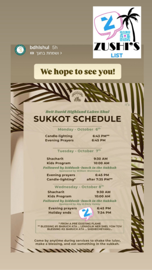- Tuesday, Oct 7: Shacharit 9:30 AM | Kids Program 10:00 AM | Kiddush-Lunch in the Sukkah (sponsored by William Weintraub) | Evening Prayers 6:45 PM | Candle-lighting after 7:35 PM