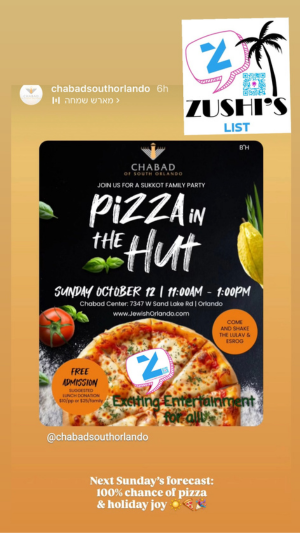 Celebrate Sukkot with the whole family at Chabad of South Orlando! Enjoy pizza in the Sukkah, shake the Lulav & Esrog, and take part in exciting holiday entertainment. This family-friendly event promises joy, community spirit, and delicious food. Suggested donation supports the festive lunch, making it a meaningful and fun way to celebrate Sukkot together.