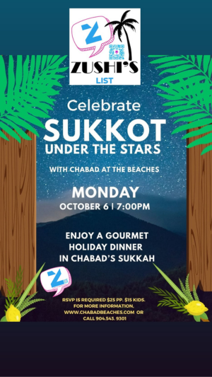 Join Chabad at the Beaches for a magical Sukkot celebration under the stars! Enjoy a gourmet holiday dinner in Chabad’s sukkah, perfect for families and friends looking to celebrate together. RSVP is required to secure your spot for this special evening of community, food, and festive joy.