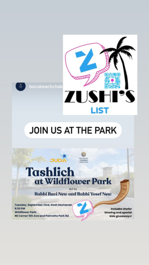 Join Boca Beach Chabad for Tashlich at Wildflower Park this Rosh Hashanah, led by Rabbi Ruvi New and Rabbi Yosef New. Experience the powerful mitzvah of casting away our past year’s missteps in a beautiful outdoor setting. The program includes shofar blowing, uplifting community spirit, and special giveaways for kids. A meaningful, family-friendly way to celebrate the Jewish New Year in Boca Raton.