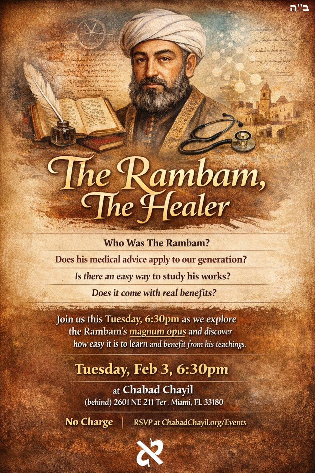 Who Was The Rambam? Does his medical advice apply to our generation? Is there an easy way to study his works? Does it come with real benefits? Join us this Tuesday, 6:30pm as we learn more about the Rambam’s magnum opus and how easy it is to learn it and glean from its benefits.