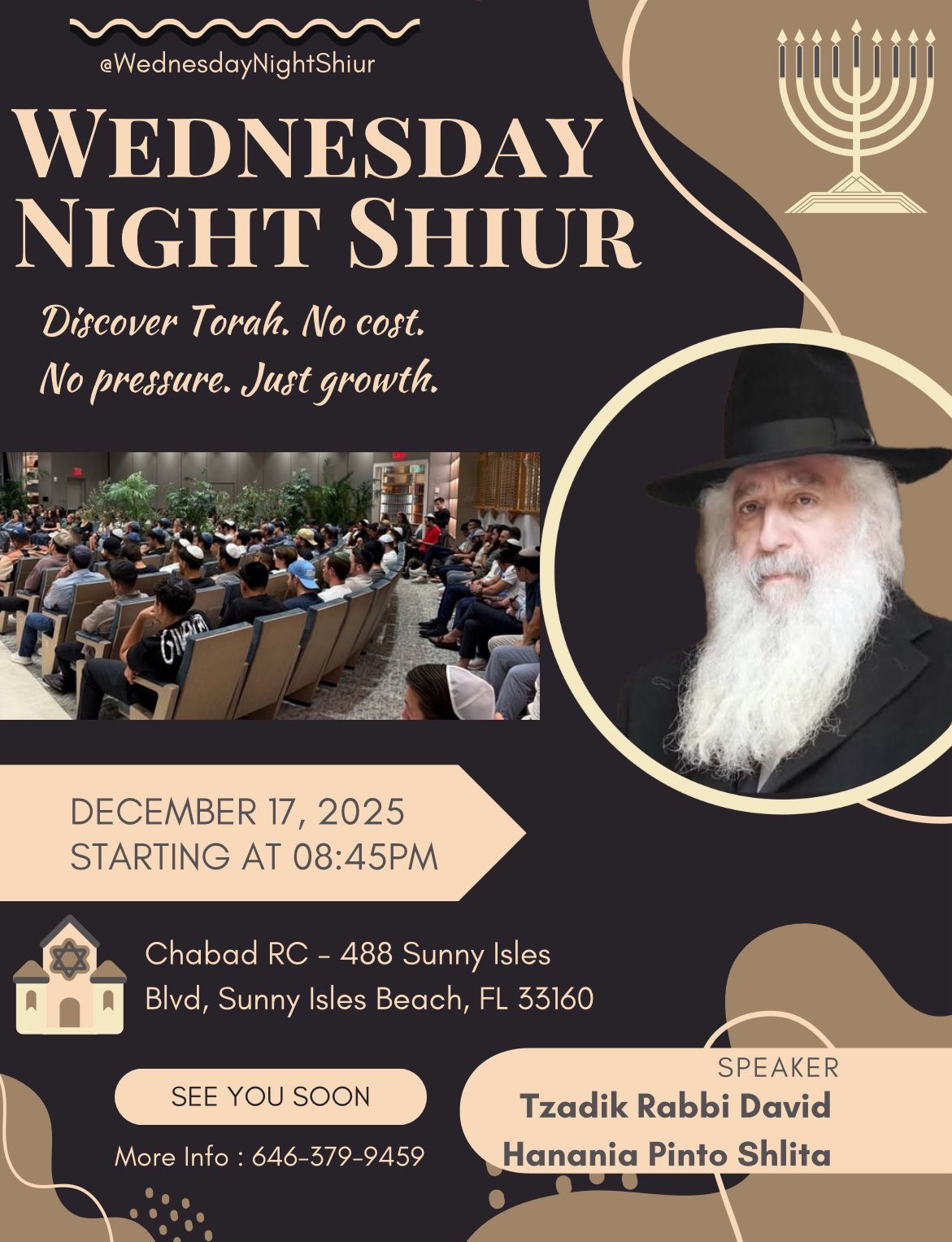 *Join us this Wednesday night at 8:45 PM* for a special *Torah shiur and candle lighting* with the Tzadik *Rabbi David Hanania Pinto, shlita.*