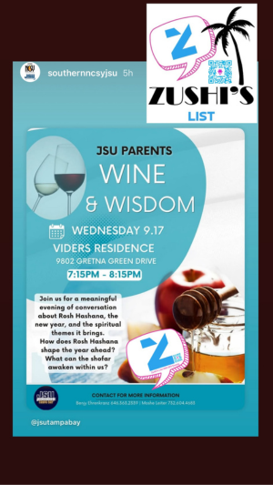 Join Southern NCSY JSU Parents for Wine & Wisdom on Wednesday, September 17, from 7:15 PM to 8:15 PM at the Viders Residence in Tampa, FL. This intimate evening of conversation will explore the spiritual themes of Rosh Hashana—from the power of the shofar to how the New Year can shape the year ahead. Come together for inspiration, discussion, and community.
