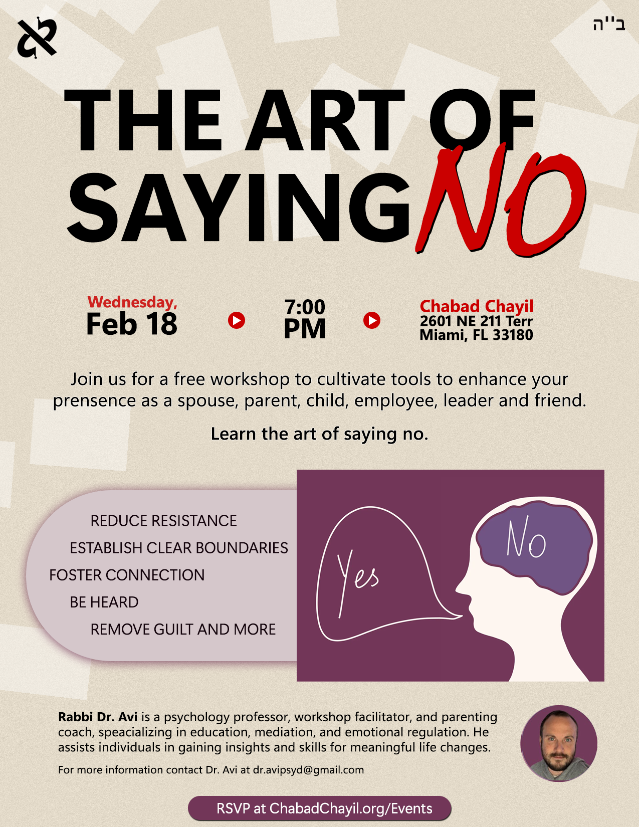 Join us for a free workshop cultivating tools to enhance your presence as a spouse, parent, child, employee, leader and friend. Learn the art of saying no. Reduce resistance, establish clear boundaries, be heard, remove guilt and more!