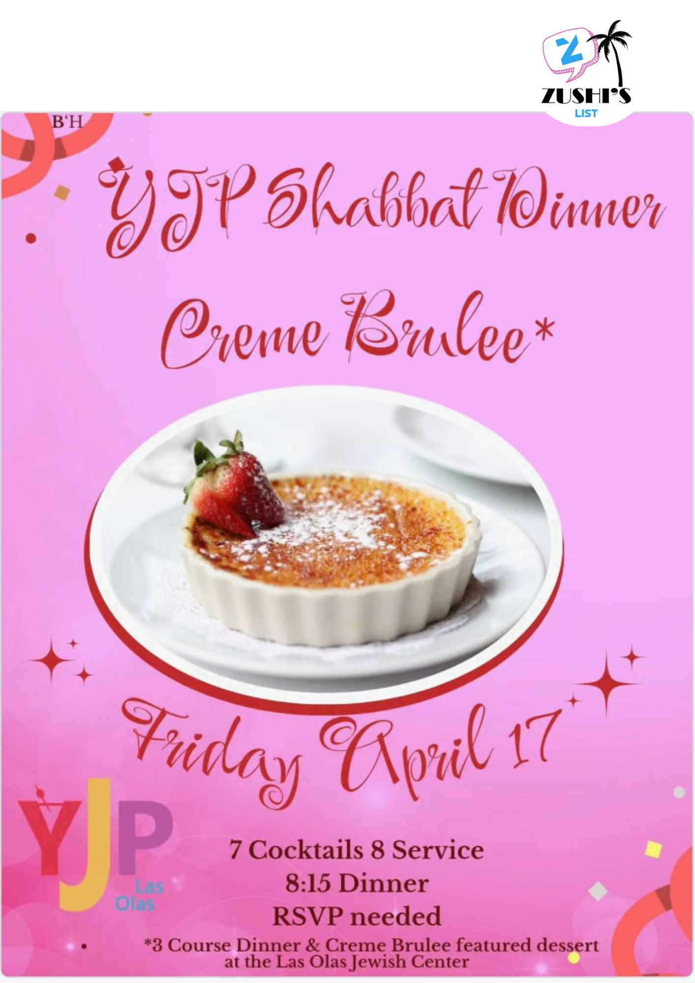 *3 Course Dinner & Creme Brulee featured dessert at the Las Olas Jewish Center