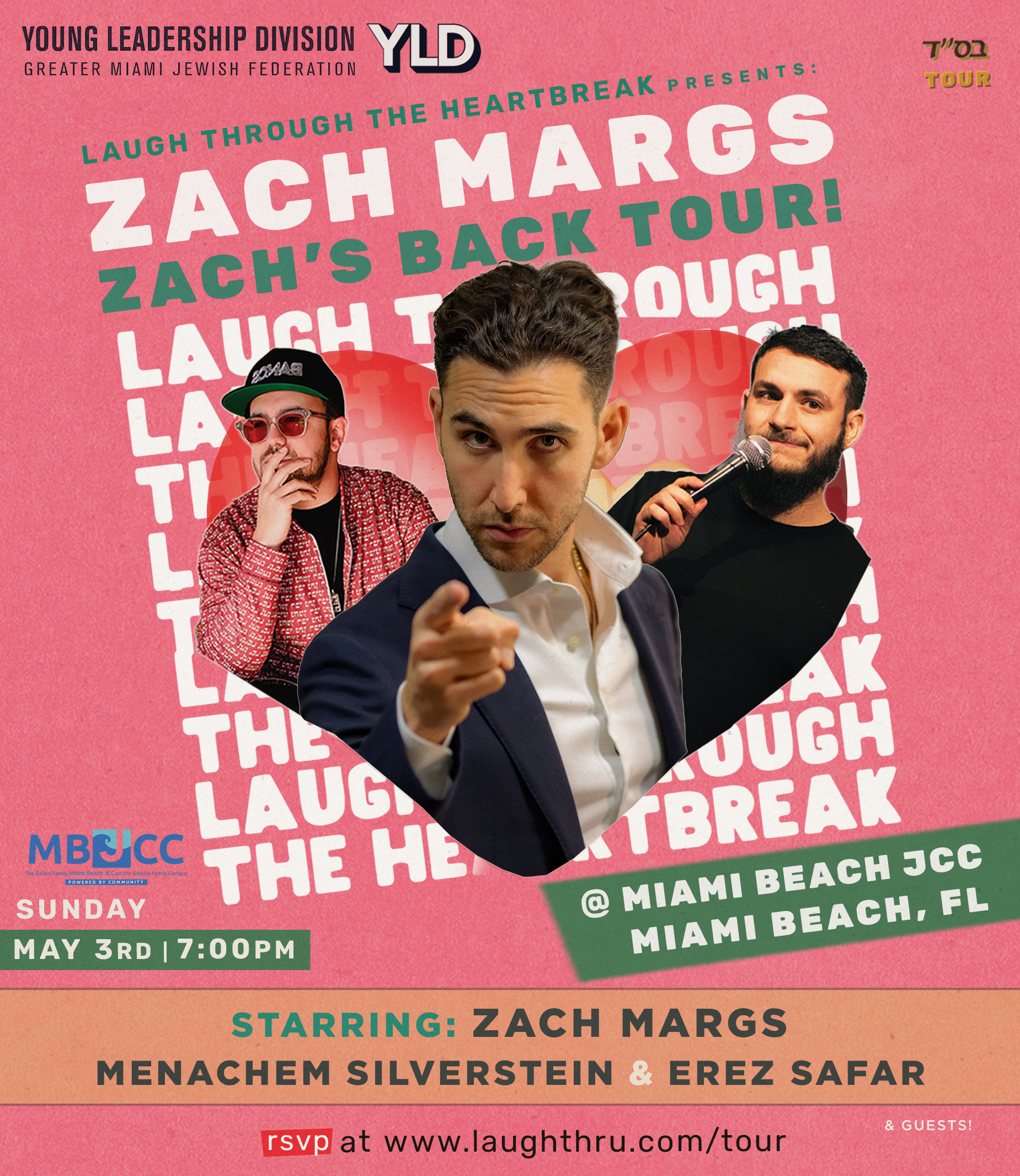 Laugh Through The Heartbreak is a sold-out comedy experience touring nationwide. Featuring Zach Margs, a viral British Jewish comedian known for his sharp takes on Jewish and Israeli culture, plus Menachem Silverstein, Erez Safar, and a special guest.