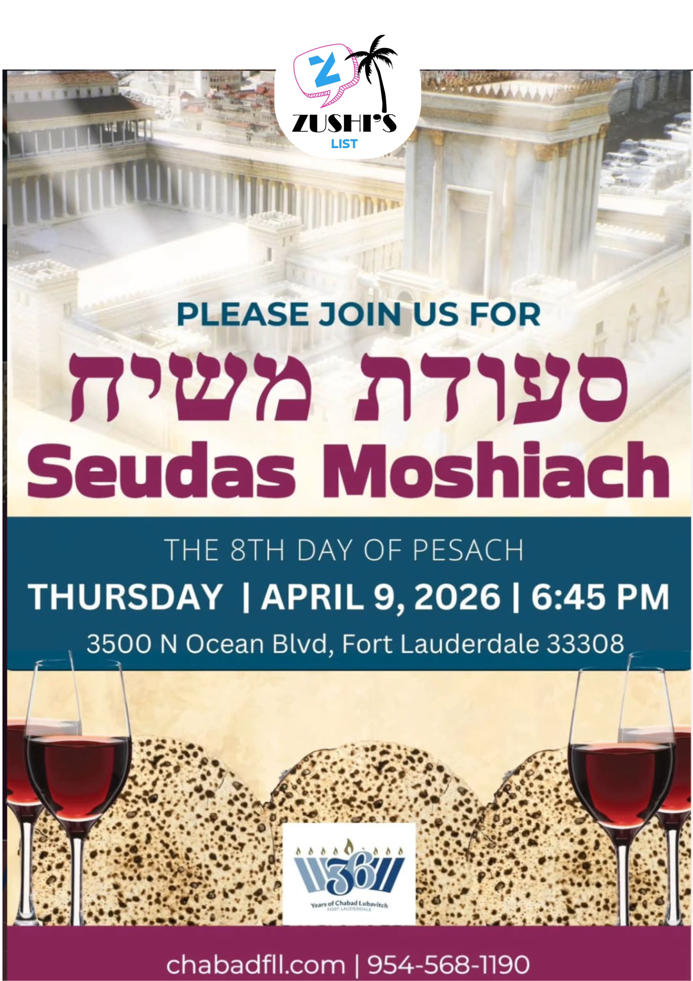 3500 N Ocean Blvd, Fort Lauderdale 33308 , United StatesPLEASE JOIN US FOR Seudas Moshiach THE 8TH DAY OF PESACH THURSDAY | APRIL 9, 2026 | 6:45 PM 3500 […]