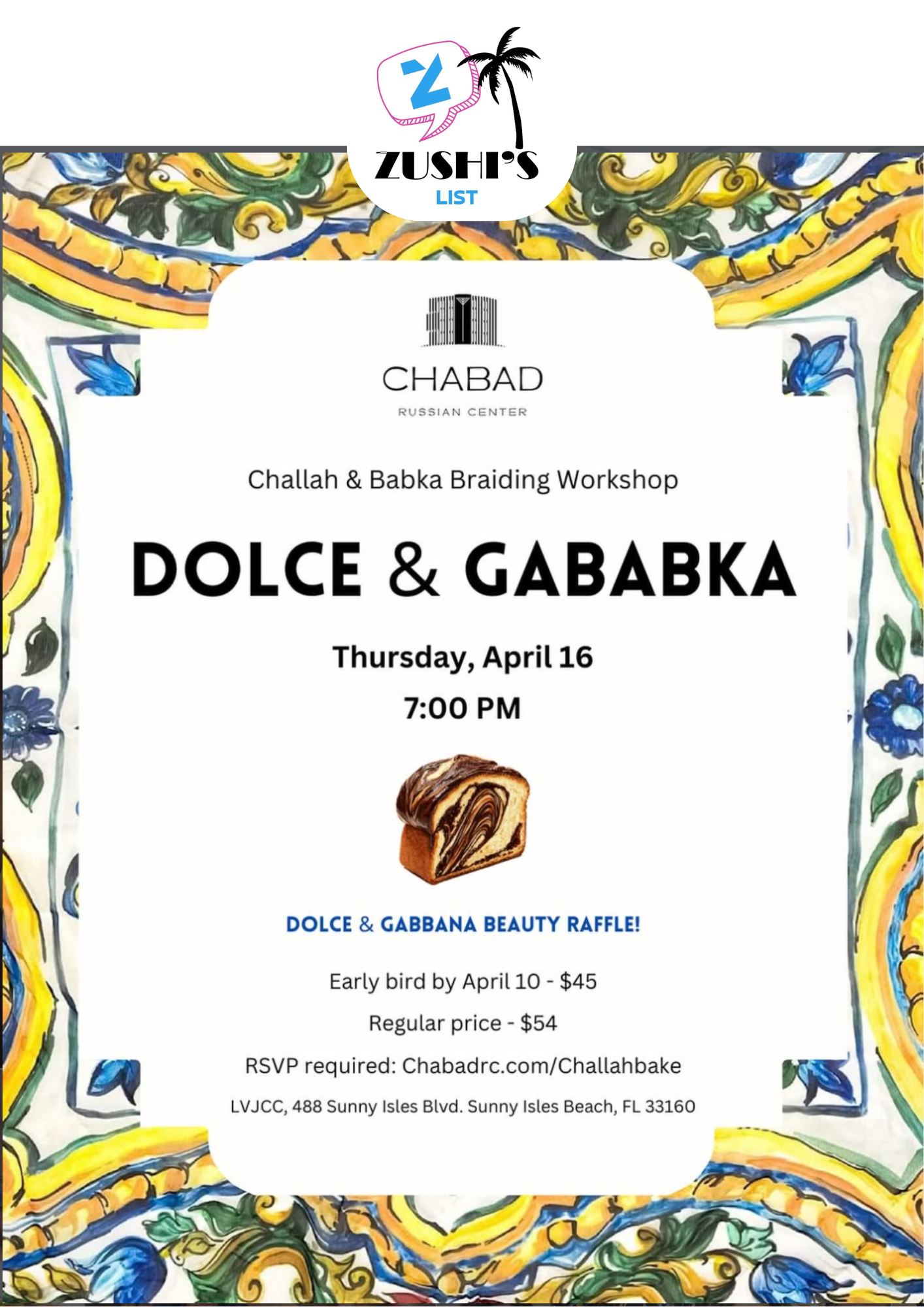 LVJCC 488 Sunny Isles Blvd. Sunny Isles Beach, FL 33160, United StatesChallah & Babka Braiding Workshop DOLCE & GABABKA Thursday, April 16 - 7:00 PM DOLCE & GABBANA BEAUTY RAFFLE! Early […]