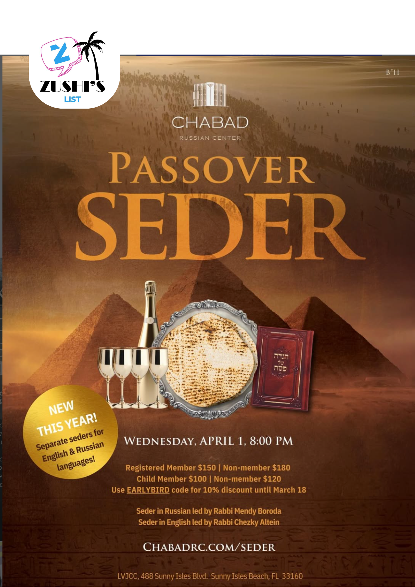 LVJCC, 488 Sunny Isles Blvd. Sunny Isles Beach, FL 33160 , United StatesCHABAD RUSSIAN CENTER PASSOVER SEDER NEW THIS YEAR! Separate seders for English & Russian languages! WEDNESDAY, APRIL 1, 8:00 PM […]